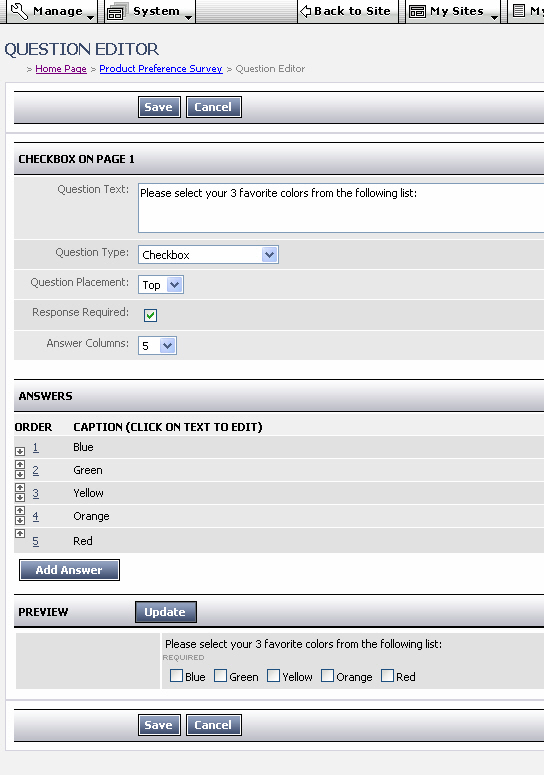 The Answers section of the Question Editor is used for entering lists of possible responses from which your users will choose when answering the questions.