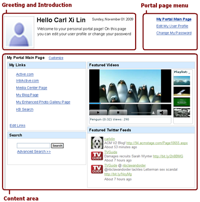 The User Portal page layout includes a section for greetings and an introduction at the top left, the Portal page menu in the upper right corner with links for editing information and changing passwords, and a main body section where the pagelets and other information are displayed. The pagelets area is divided into columns that you configure when you create the User Portal page. Multiple pagelets can then be displayed in each column, creating a multi-section grid-like format to your User Portal page. For example, you might choose to include a Quick Links pagelet with useful or commonly-used links, a pagelet for displaying current articles of interest, a general content pagelet with general information and a photo gallery pagelet for displaying pictures. These are just some examples of the types of information you can display on the User Portal page.