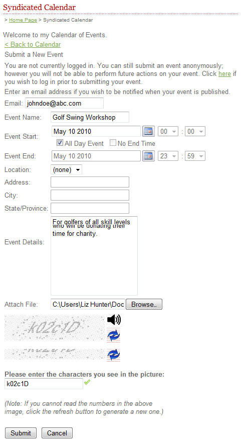 Calendar administrators can set a calendar to allow both logged-in and anonymous (not logged in) users to submit events. The event submission page is slightly different for each of these two types of users.