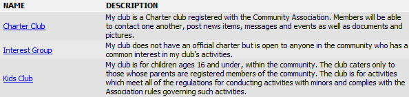 Description: The text here comes from the Description field on the page where you add a club type. You can click on the club type in the Name column to edit the description. When users are creating clubs, they will read this description when deciding which club type to assign to their club so make sure it is clear and descriptive.